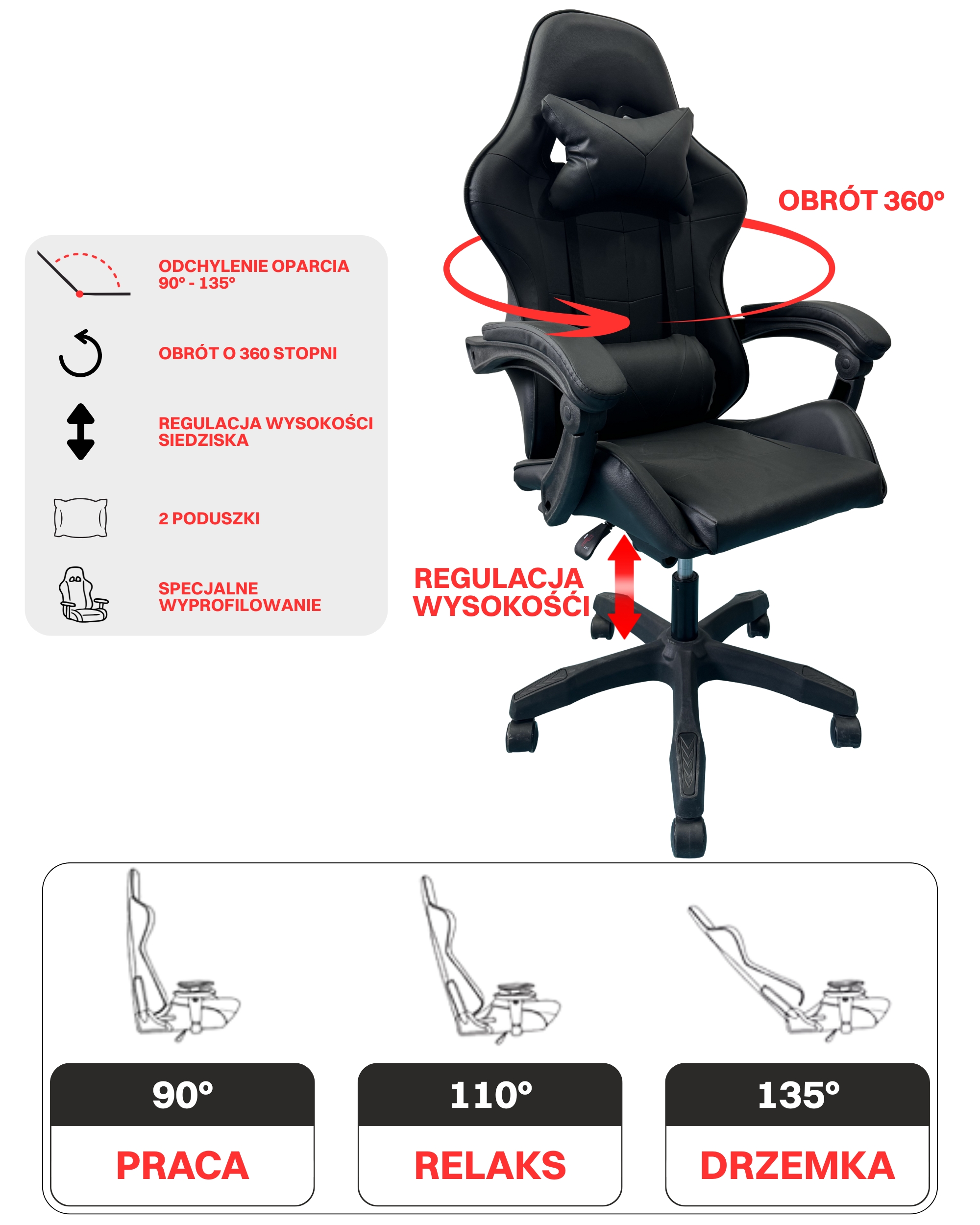 - Regulacja wysokości siedziska: 48–58,5 cm