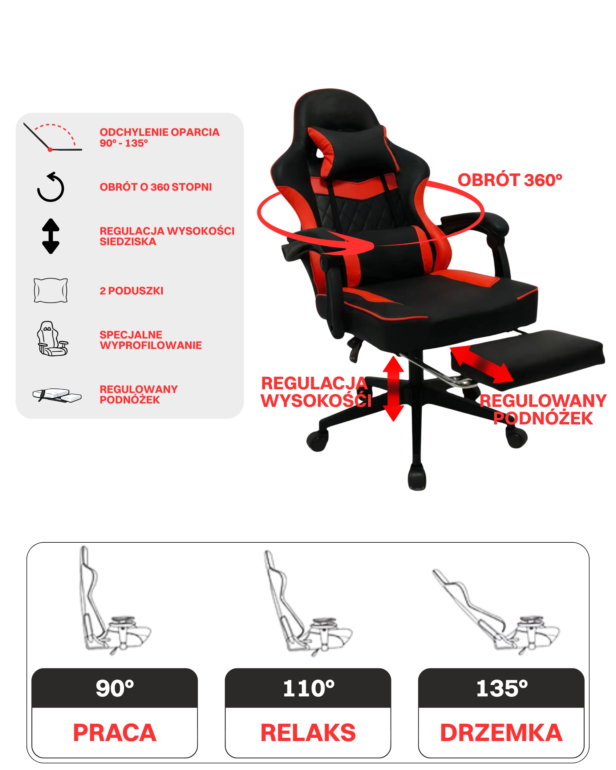 Krzesło gamingowe z podnóżkiem czerwono - czarne, wyprzedaż