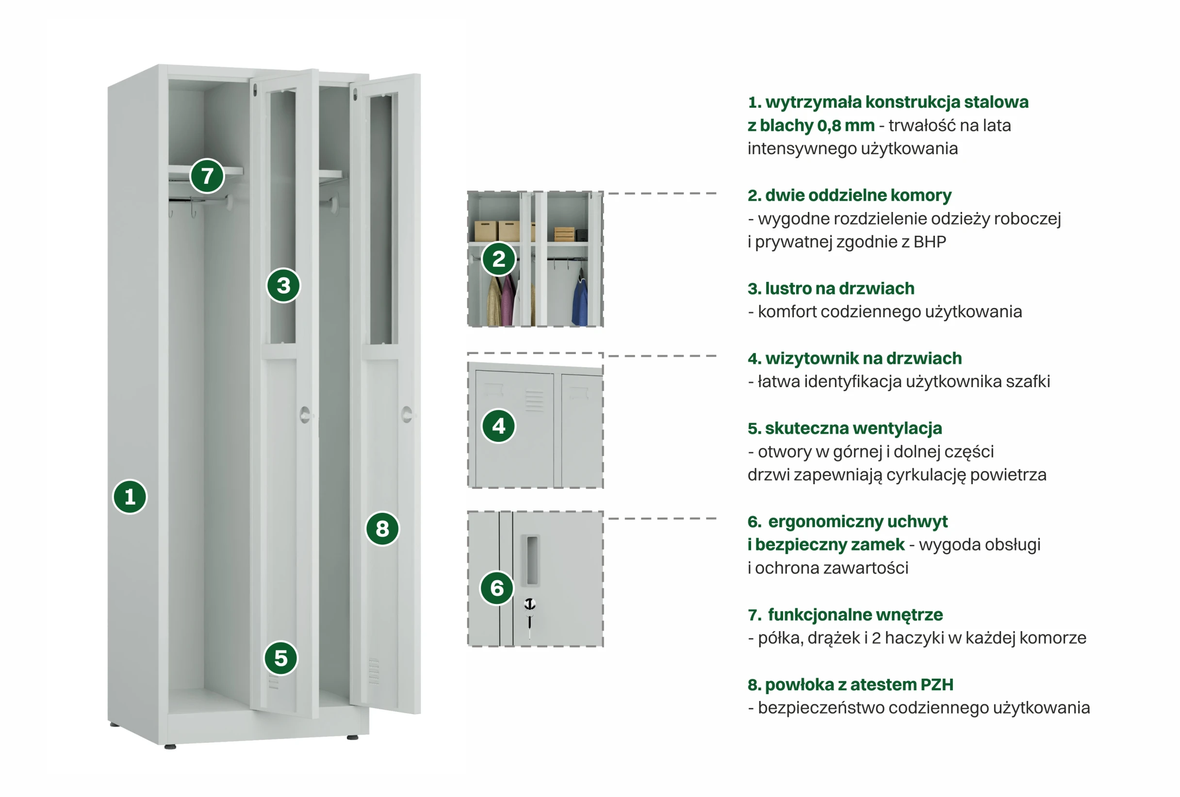 Każda komora została wyposażona w praktyczne elementy: półkę na rzeczy osobiste, drążek z haczykami, lustro oraz miejsce na wizytownik. Otwory wentylacyjne w drzwiach wspierają cyrkulację powietrza, co wpływa na higienę i komfort przechowywania.