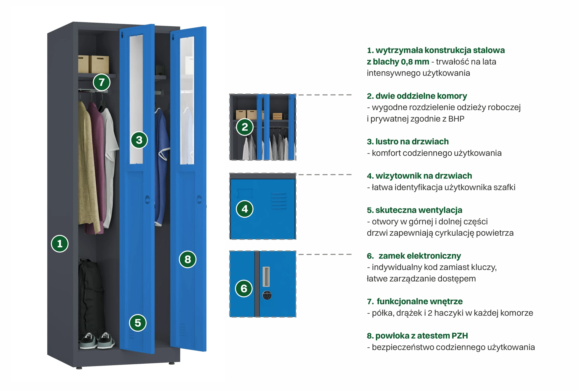 - Funkcjonalne wyposażenie - każda komora zawiera półkę, drążek, dwa haczyki oraz lustro
