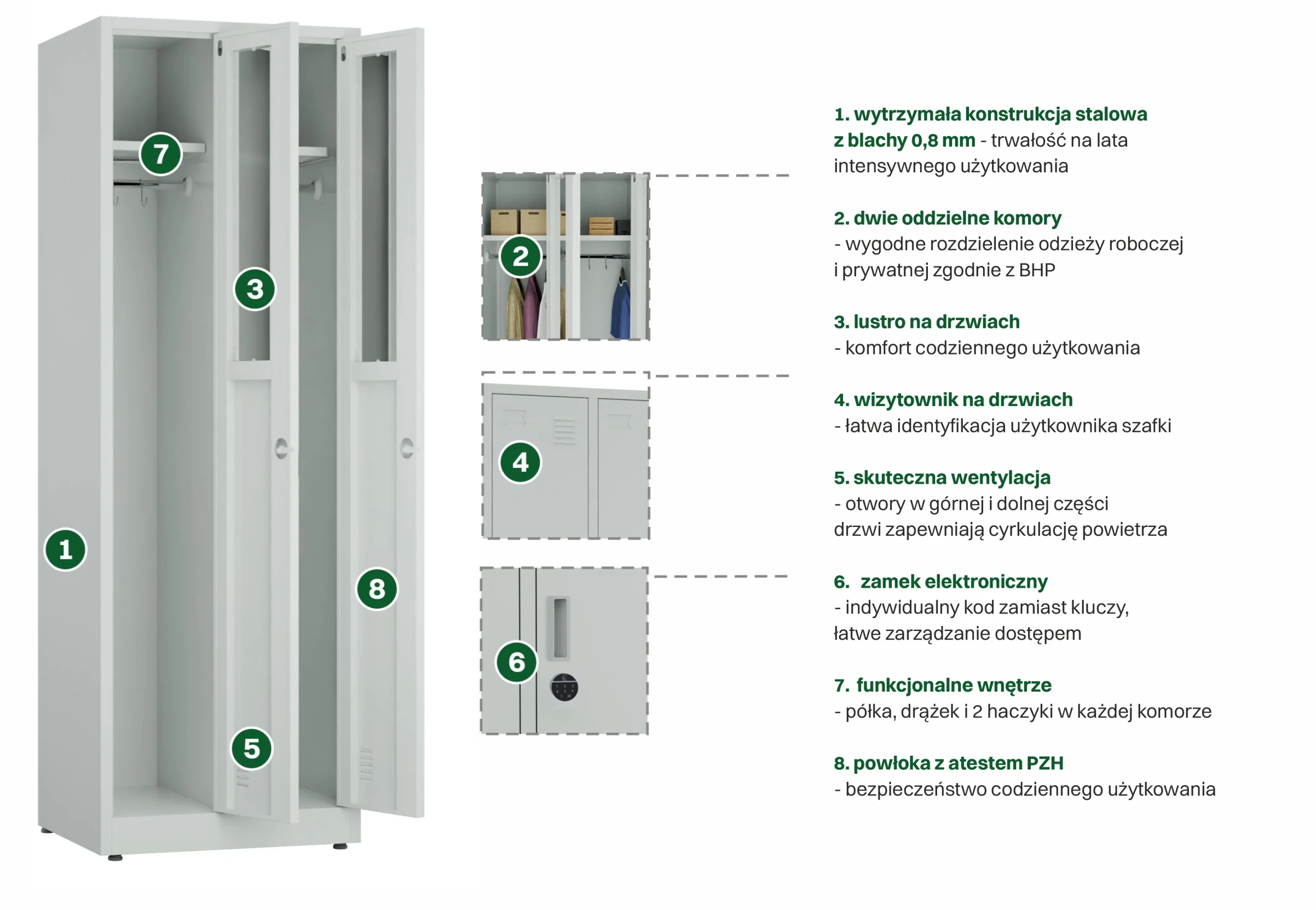 Dzięki pełnemu wyposażeniu – półce, drążkowi, haczykom, lustrze i otworom wentylacyjnym – każda komora zapewnia wygodę i komfort codziennego użytkowania. Wizytowniki ułatwiają identyfikację, a regulowane stopki umożliwiają stabilne ustawienie szafy na każdym podłożu.